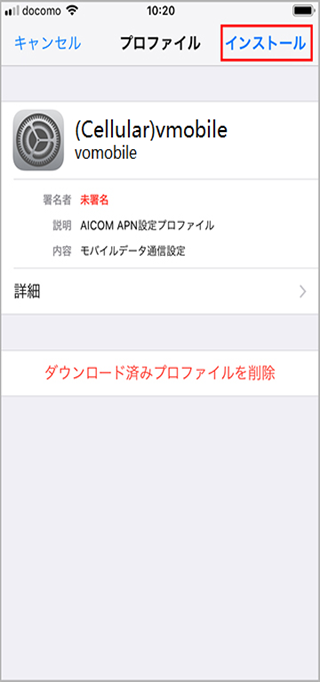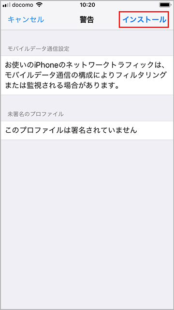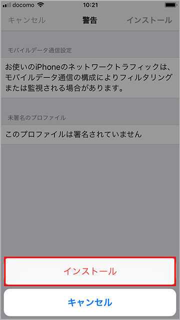 STEP3:(新しいウインドウを開きます)「プロファイルのインストール」画面が開くので、「インストール」をタップします。